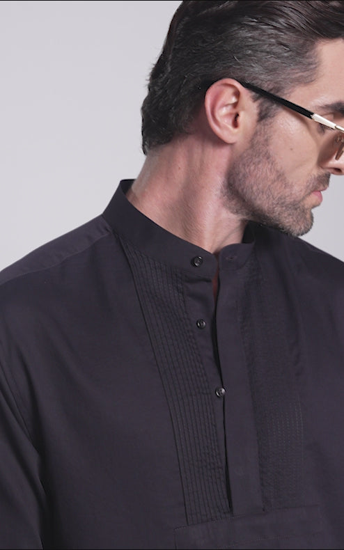 This shirt features a mandarin collar, a concealed half placket, and pintuck detailing, slim, stitched folds of fabric that add subtle texture and a refined finish. A clean, confident design for those who prefer understated boldness.
